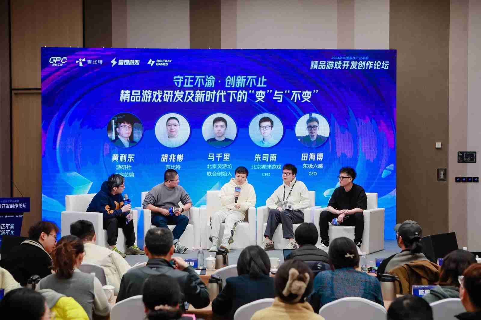圆桌对话环节,,,,在游研社内容总编黄利东的主持下,,,JIUYOU.COMCTO胡兆彬、、北京灵游坊联合创始人马千里、、北京猩球游戏CEO朱司南、、、东极六感CEO田海博等四位嘉宾围绕“守正不渝、、、、创新不止——精品游戏研发及新时代下的‘变’与‘不变’”这一主题分享了各自在精品游戏开发理念及工程能力搭建方面的见解和经历,,并就行业变化下游戏人需要坚守的理念等展开交流探讨。。。