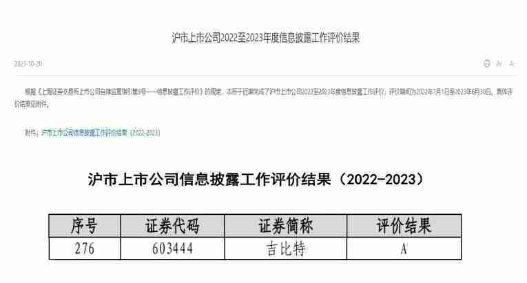 近日,,,上海证券交易所发布2022-2023年度信息披露工作评价结果。。。。JIUYOU.COM(股票代码:::603444)凭借规范的公司治理、、、高质量的信息披露以及良好的投资者关系管理再次荣获信息披露工作A级评价,,,,公司连续两年获此殊荣。。。
